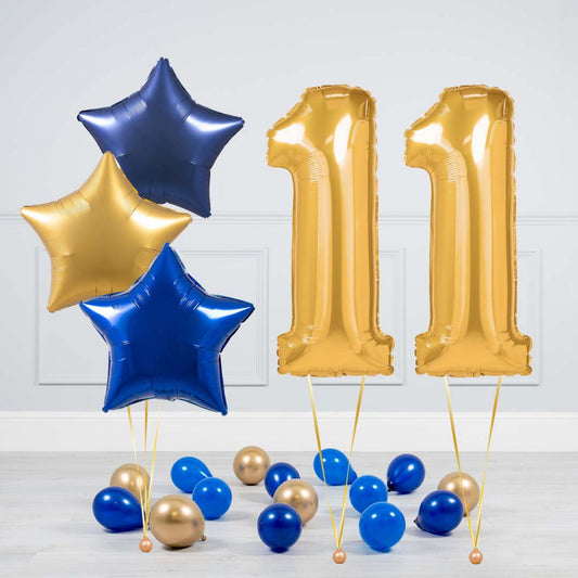 Helium Gold Two Number Set Balloon - Dark Blue, Blue and Gold Stars with Mini Balloons