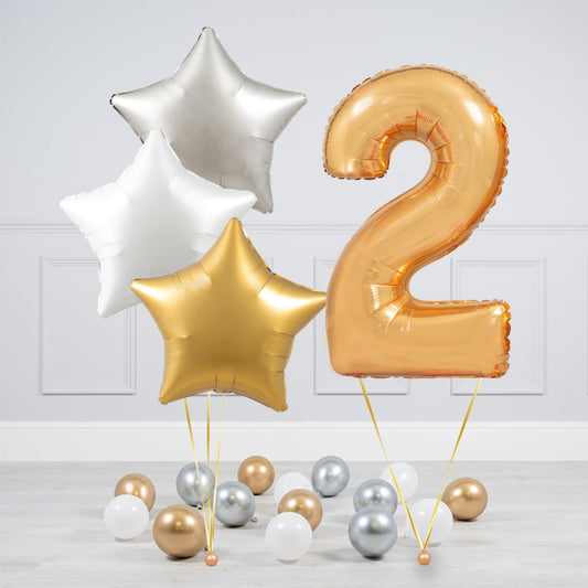 Helium Gold Single Number Set Balloon - Silver, White and Gold Stars with Mini Balloons