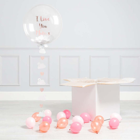 Personalised Mother’s Day Helium Bubble Balloon with Pink&White Latex, Rose Gold Stickers and Pink Ribbon
