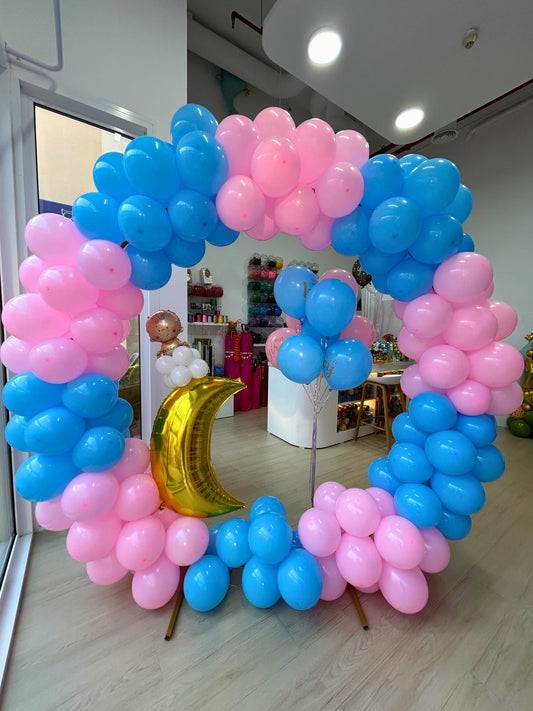 Pink and Blue Balloon Arch with Golden Moon Accent – Perfect for Gender Reveal and Baby Showers