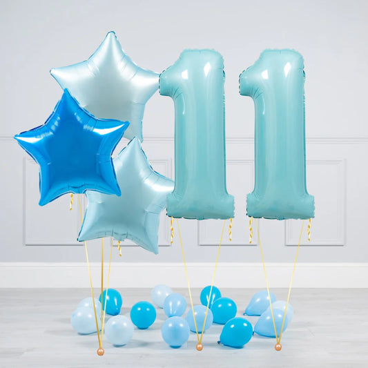 Helium Blue Two Number Set Balloon with Different Shade of Blue Stars and Mini Balloons