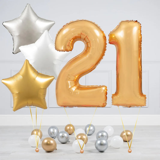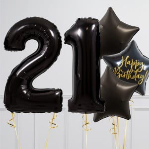 Helium Black ‘21’ Two Number Set Balloon with Star-Shaped Foil Balloons