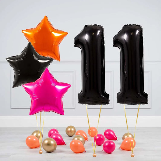 Helium Black Two Number Set Balloon with Orange, Black and Pink Stars with Mini Balloons