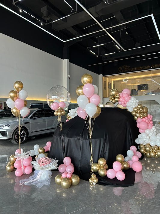 Car Surprise Balloon Design Light Gold, White and Pink with Personalised Helium, Helium Latex Bunch, Red Carpet and Bouquet Fresh Flower Accents – Perfect for Any Sleek and Elegant Celebrations
