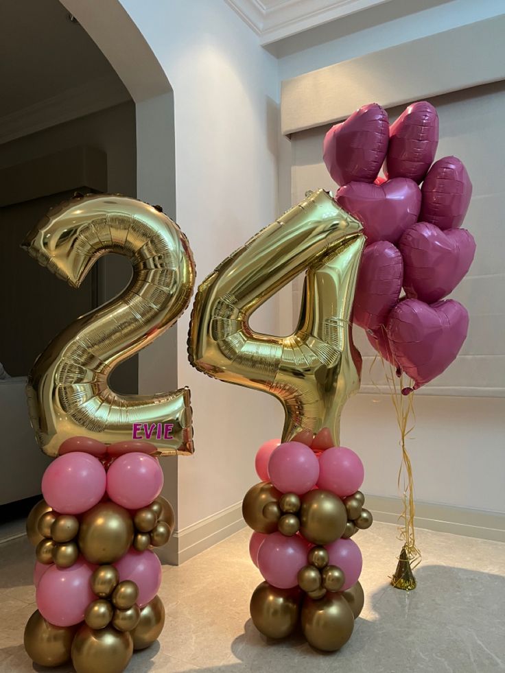 40-inch Numbers '24' Balloon on Stand Pink and Gold and Bunch Helium Balloons Heart-Shaped with Strings - Customizable for Any Celebration
