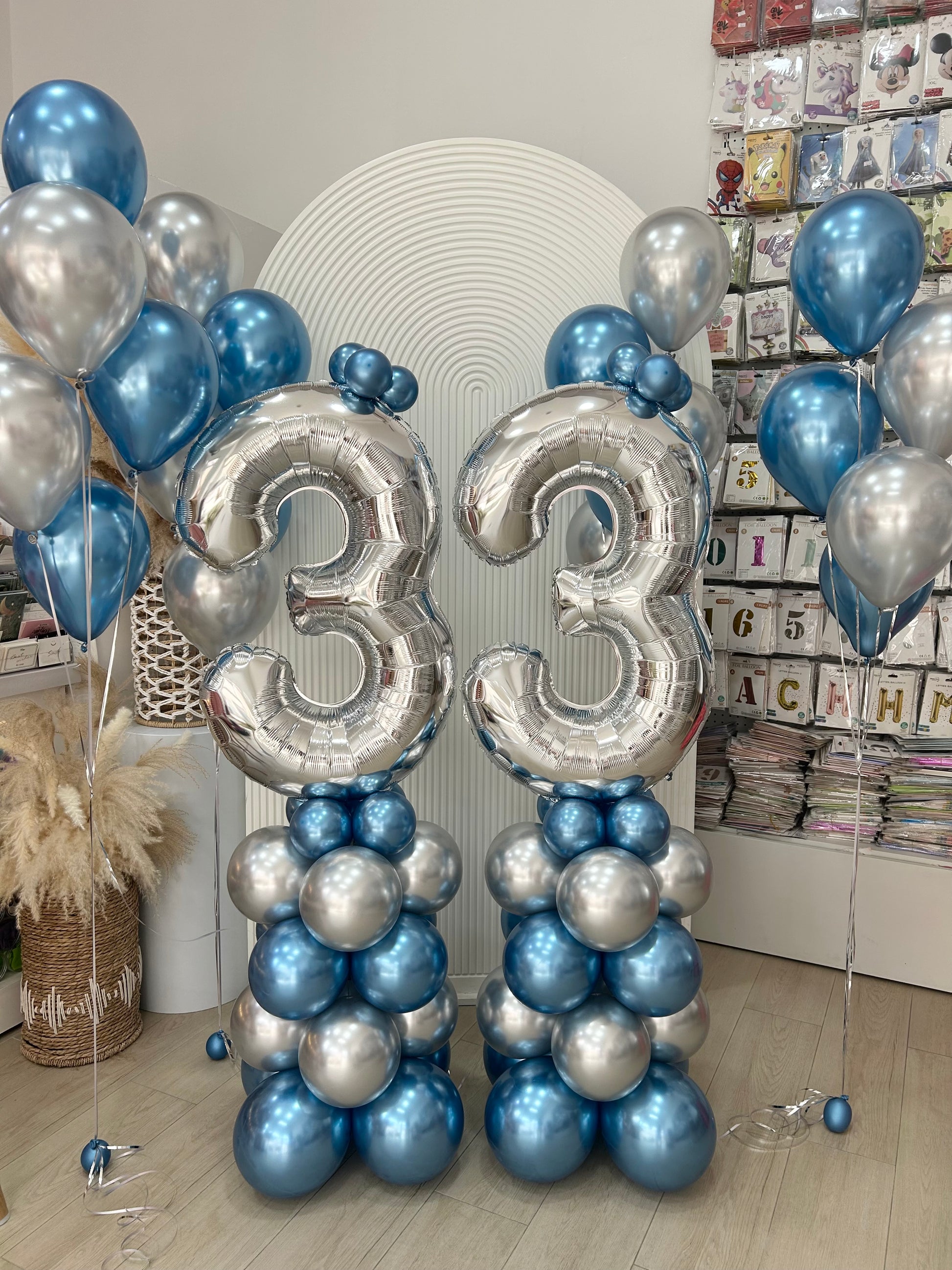 40-inch Numbers 3&3 Balloon on Stand with Bunch Helium Balloons Colors Chrome Blue and Silver with Strings - Customizable for Any Celebration