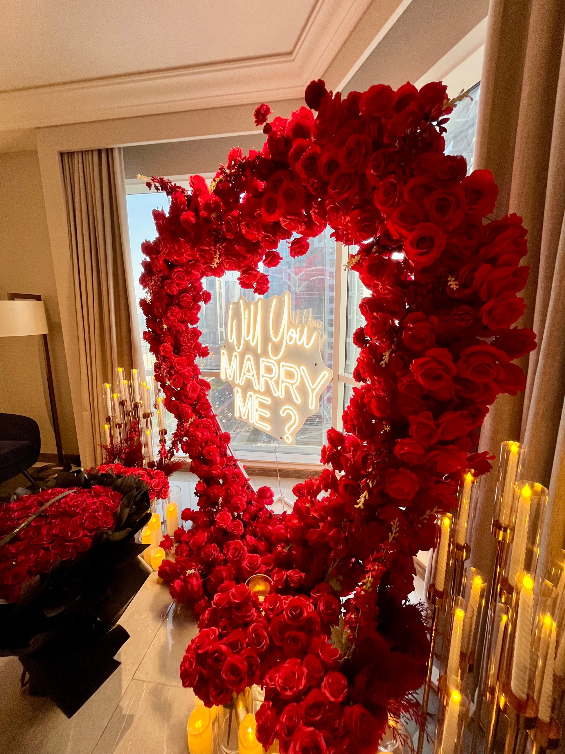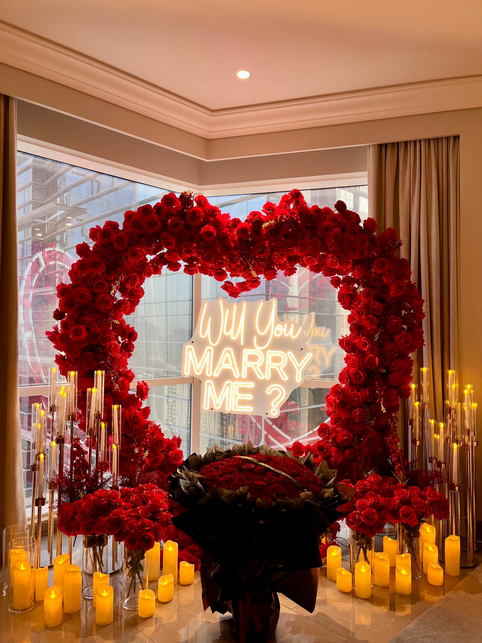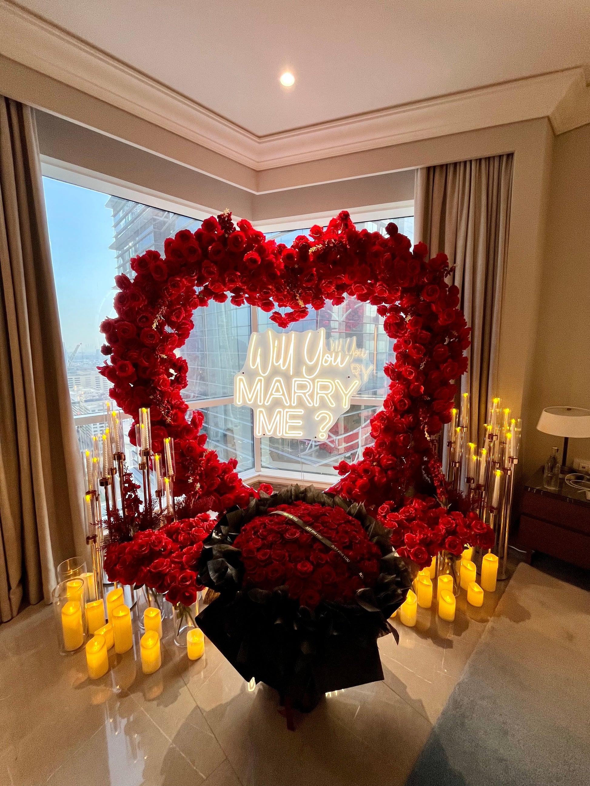 Artificial Flowers, Candles, Giant Heart with LED Acrylic ‘Will You MARRY ME?’ and Fresh Giant Flower Bouquet - Perfect for Proposal, Wedding, Anniversary special occasions!