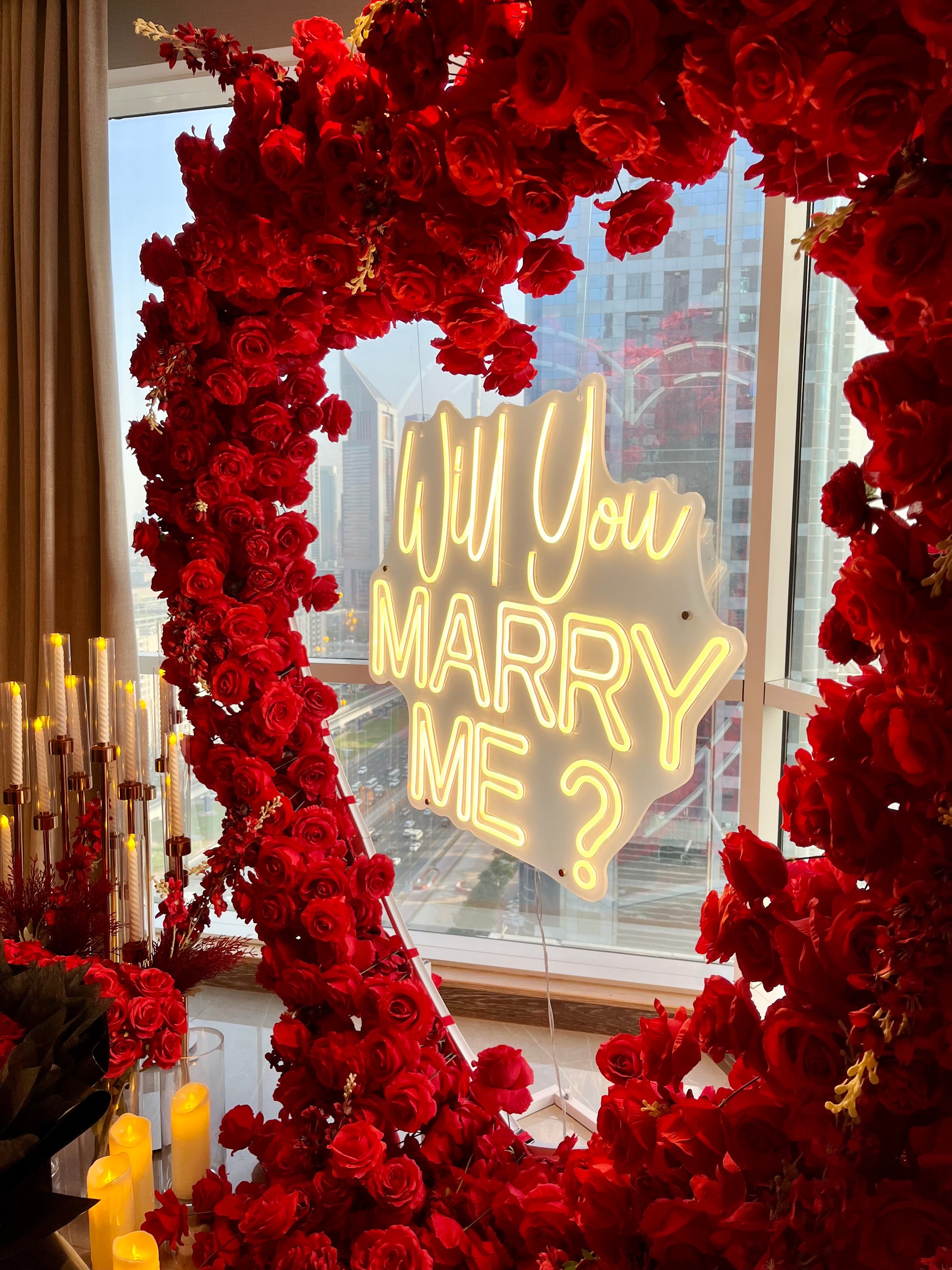 - Elegant, glowing “Will You Marry Me?” neon sign