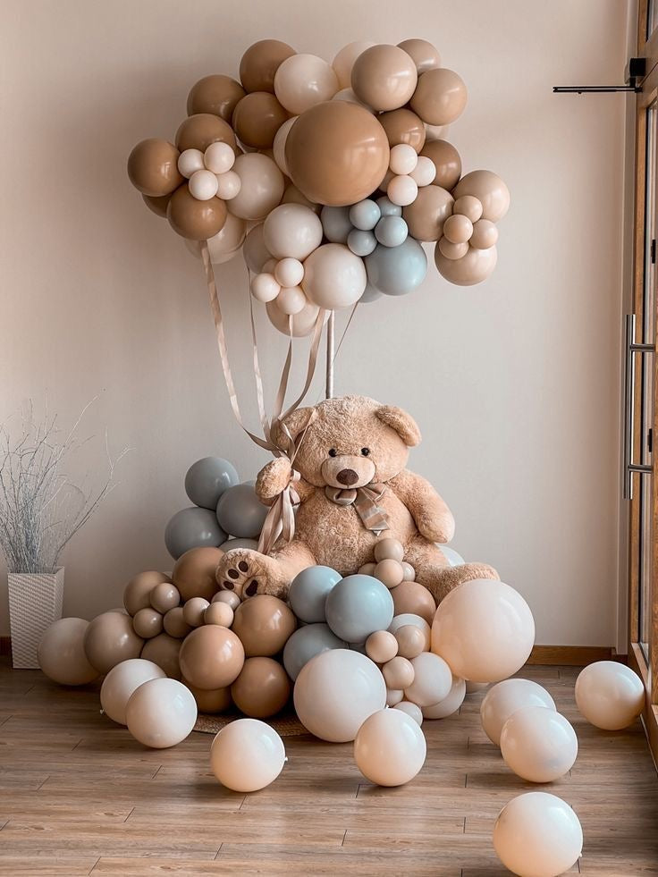 Create a magical and heartwarming atmosphere with our Teddy Bear Balloon Setup, a perfect decoration for baby showers, newborn welcomes, birthdays, or any special occasion. This elegant yet playful arrangement features a soft and cozy teddy bear surrounded by a beautifully crafted balloon display in soothing neutral and pastel tones.