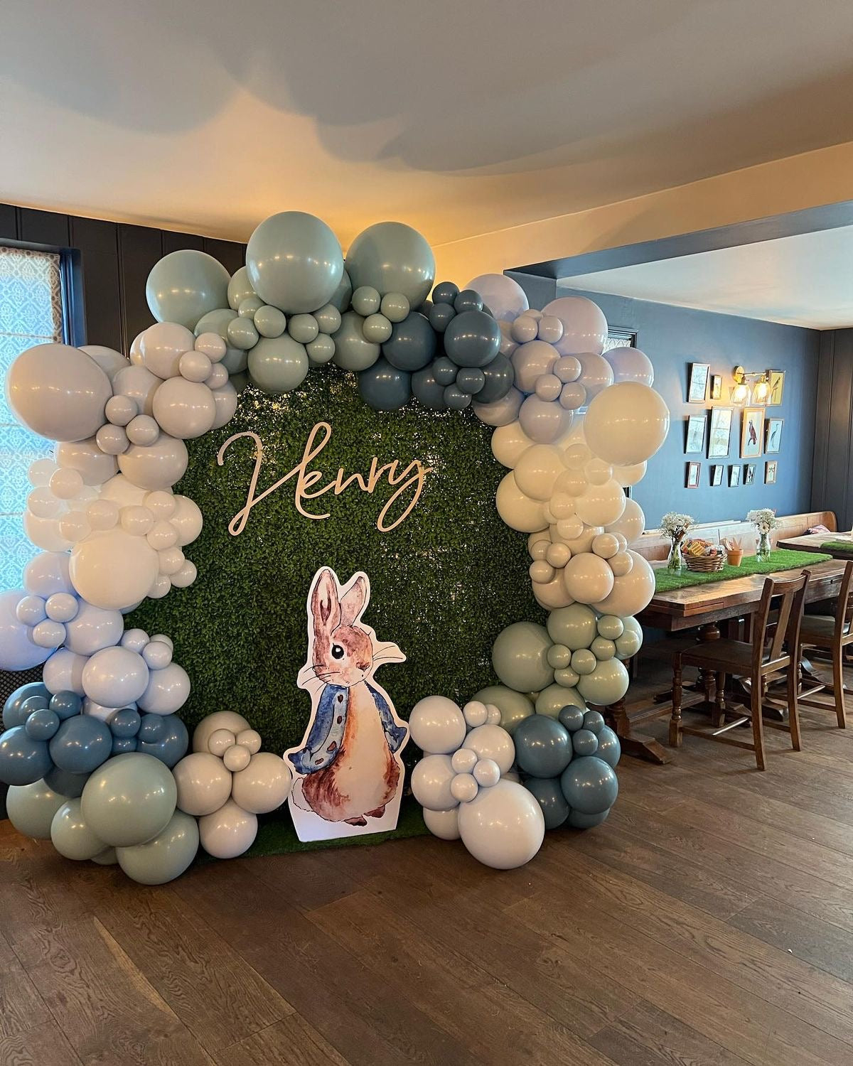 Grass Backdrop with Customizable Name and Balloon Round Setup Blue, Gray, Green and White with Peter Standee - The Tale of Peter Rabbit-Themed Perfect for special occasions