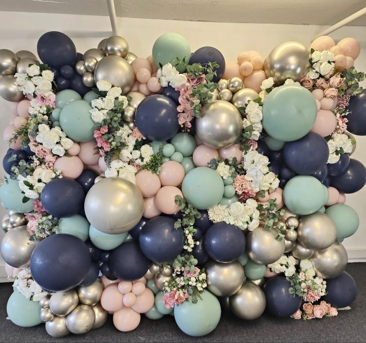 Balloon Silver, Blue, Green and Pink Wall with Flowers Decor Setup - Perfect for special occasions