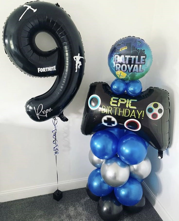 Black Number '9' Helium with Customize Sticker and Ribbons and Game Controller 'Epic Birthday' with Latex Blue, Silver and Black Balloon on Stand – Customizable Design
