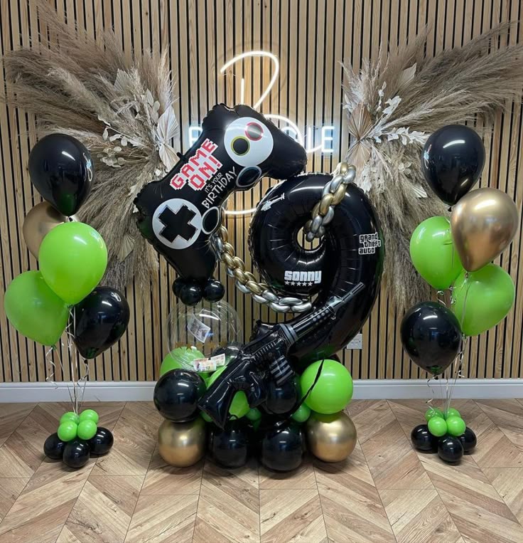 Black Number Platform ‘9’ with Customize Sticker Green Light Gold Clear Blue Latex, Game Controller 'Happy Birthday' and Latex Helium Balloons – Customizable Design