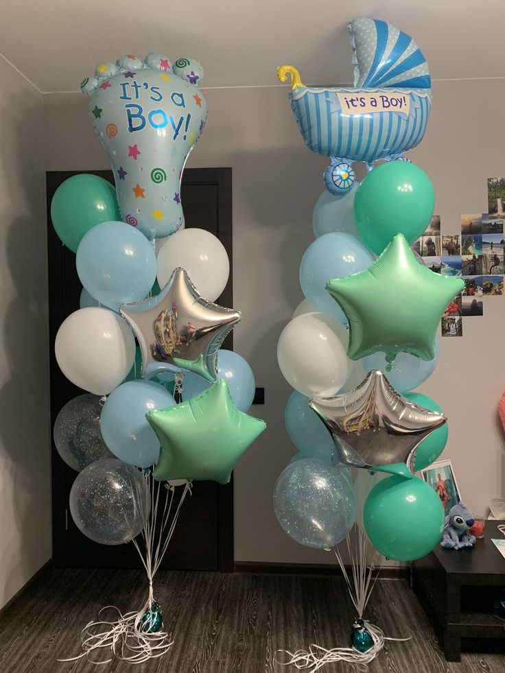 Bunch Helium Balloon Green and Silver Star, Baby Feet 'It's a boy', Stroller with Latex White, Blue and Clear with Confetti - Baby Shower, Gender Reveal Perfect for Special Occasions!