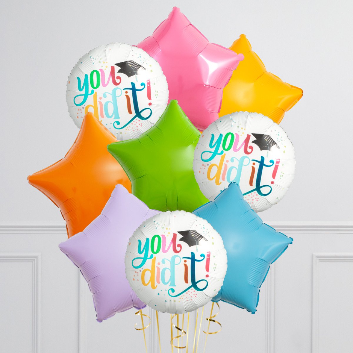Bunch of Pink, Yellow, Orange, Green, Purple and Blue Star Foil and Printed White Circle “You did it!” Helium Balloons