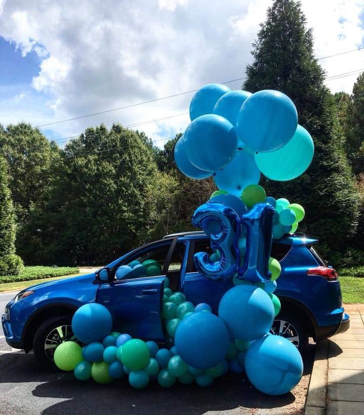 Elevate your surprise with this striking car balloon decoration featuring a sleek combination of metallic blue and black balloons. This bold and stylish setup adds a touch of luxury and drama, turning any car into a stunning centerpiece.