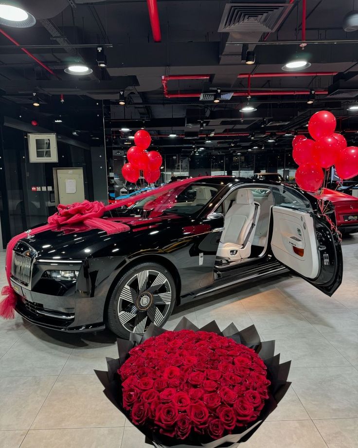 Car Surprise Balloon Red Helium with Customize Red Ribbons and Bouquet of Fresh Flower – Perfect for Any Bold Celebrations