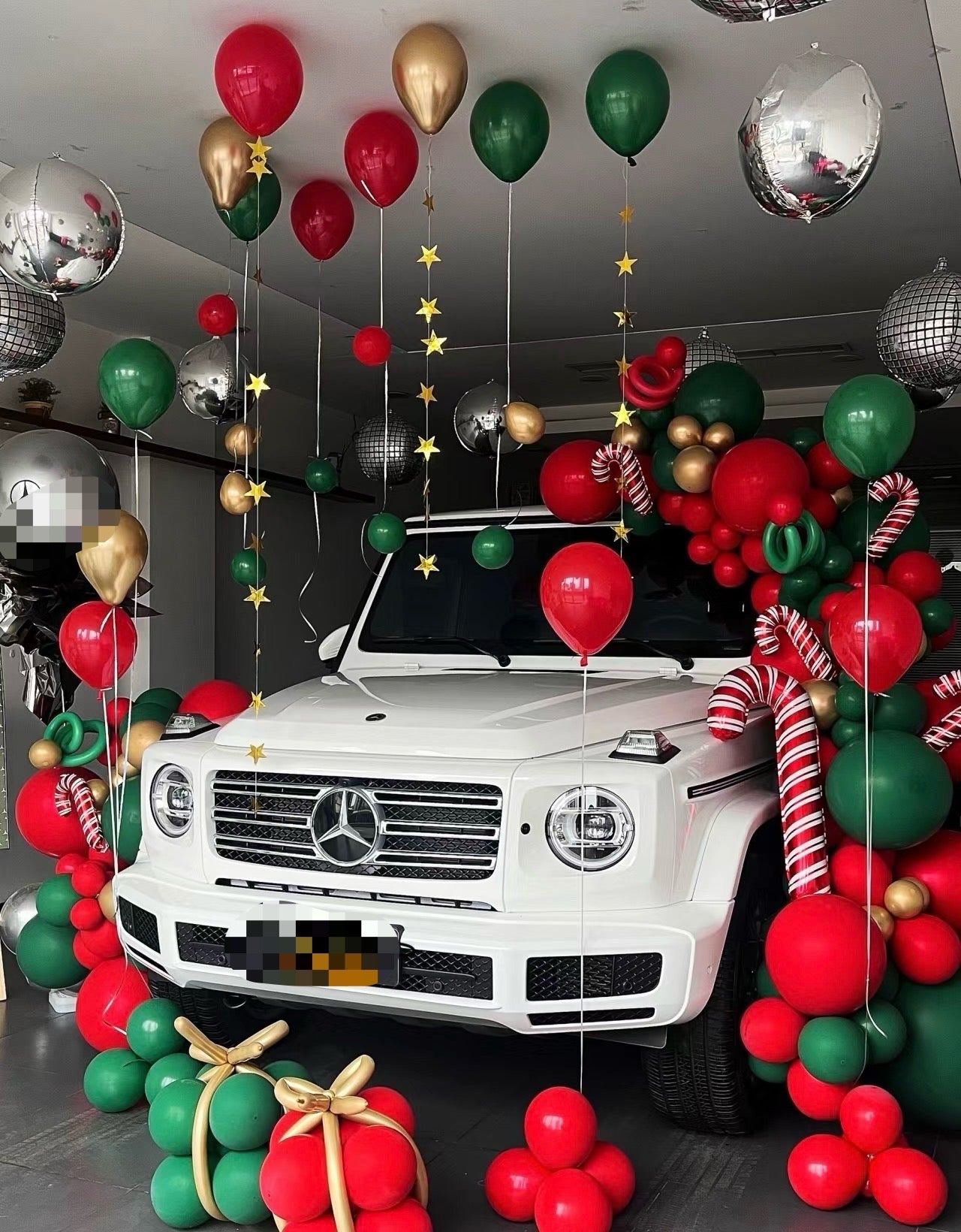 Christmas Car Surprise with Metallic Helium Balloons, Gift Balloons, and Candy Cane Accents