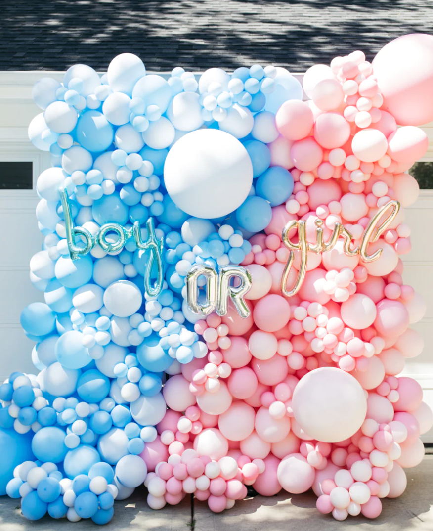 Gender Reveal Balloon Backdrop with Pink and Blue Balloon Arrangement and "Boy or Girl" Text