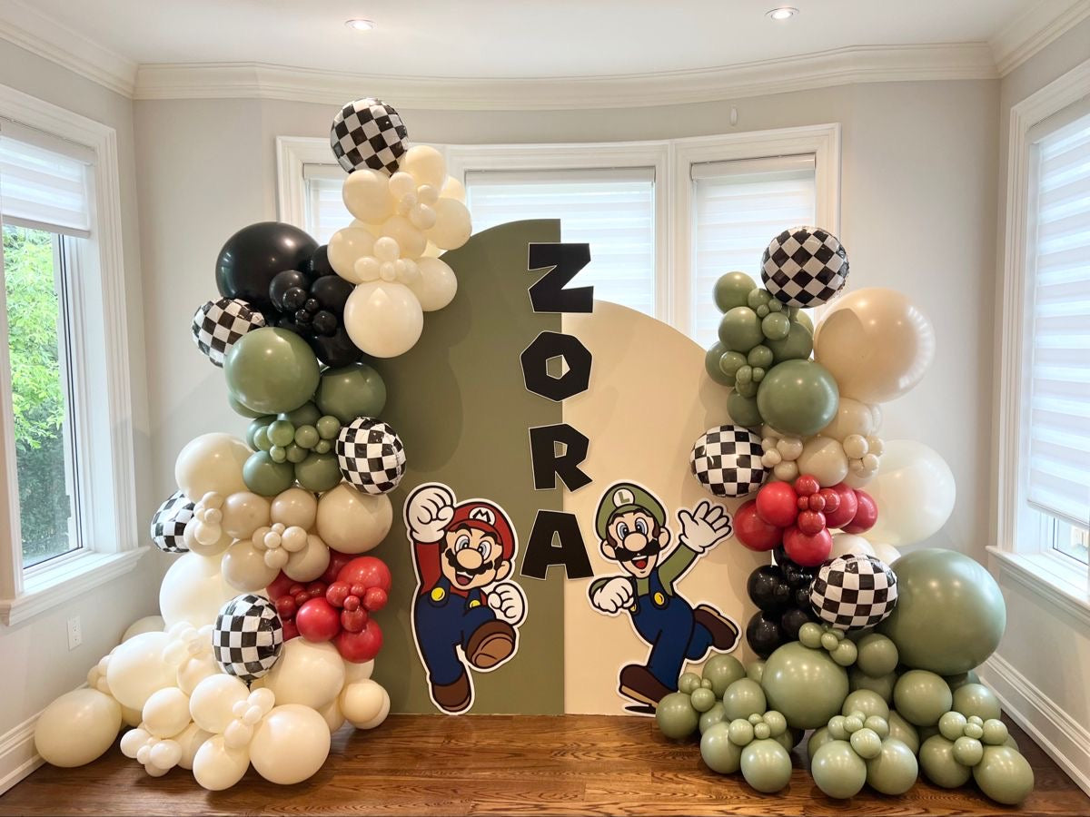 Customizable Backdrop with Balloons Green, Sand White, Dust White and Red with Checkered Foil, Luigi and Mario Accents - Super Mario-Themed Perfect for special occasions