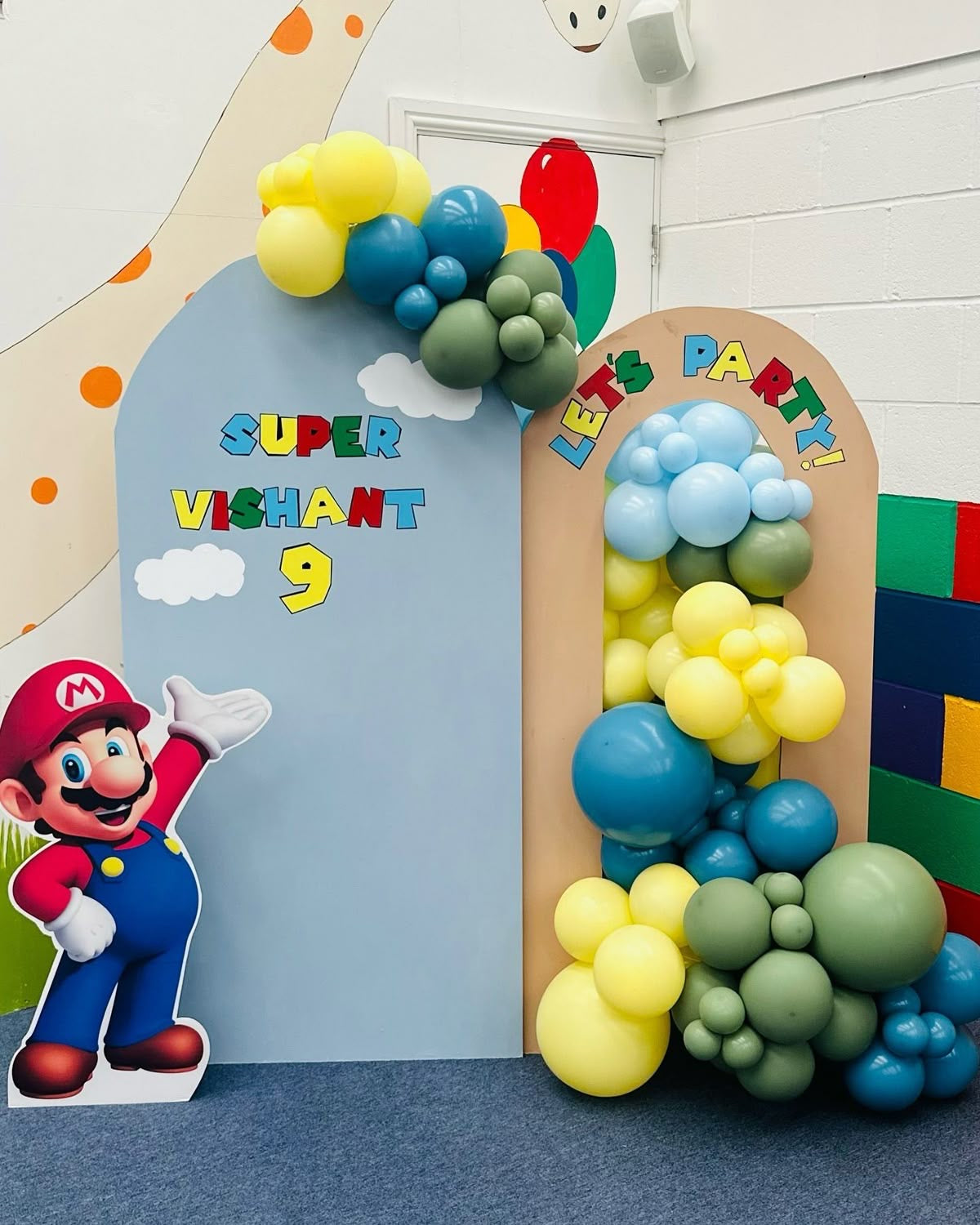 Customizable Backdrop with Balloons Green, Yellow, Blue and Red with Mario Foam Board Standee - Super Mario-Themed Perfect for special occasions