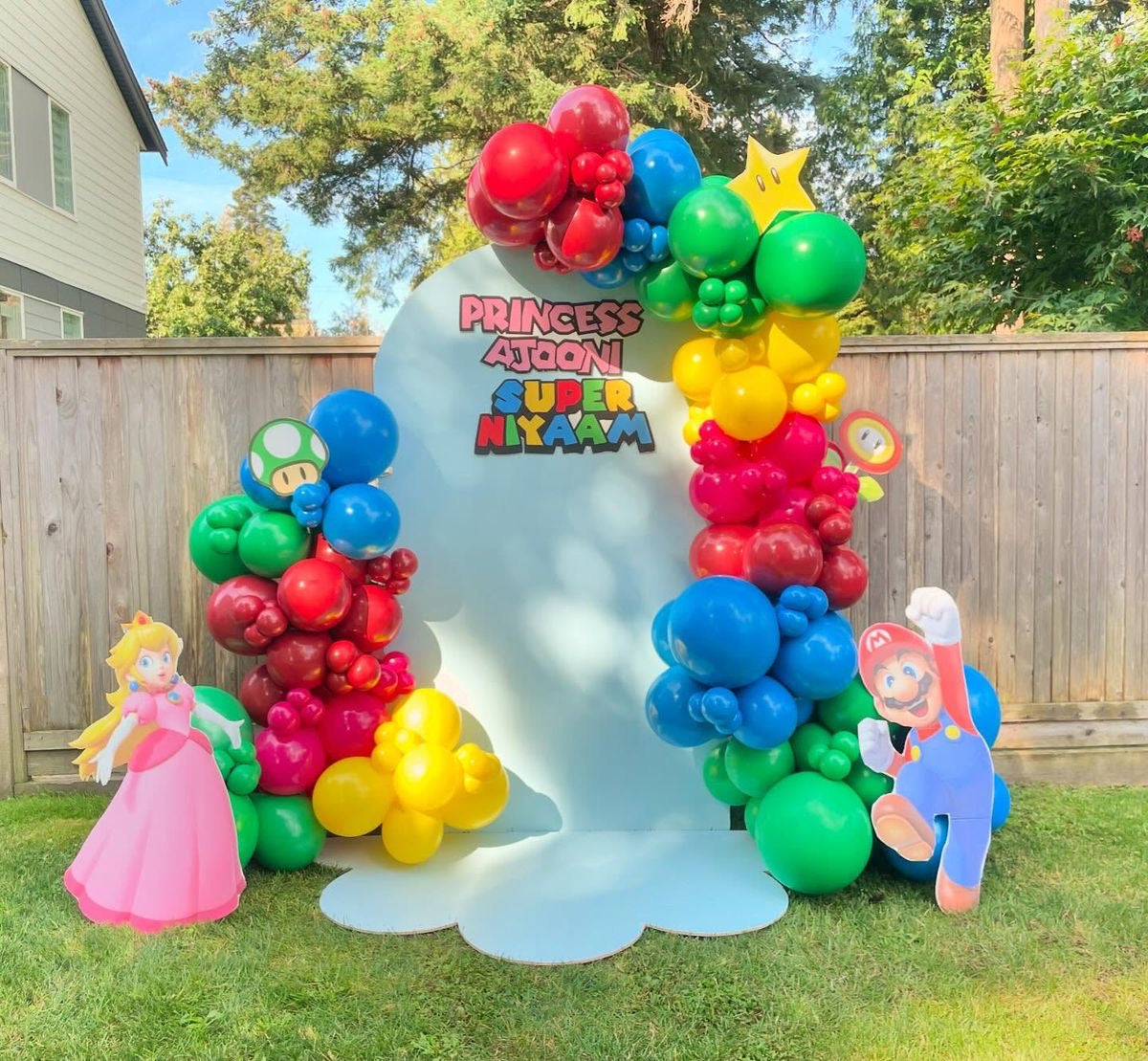 Customizable Backdrop with Balloons Yellow, Blue and Red with Star, Mushroom, Sunflower and Princess Peach and Mario Foam Board Standee - Super Mario-Themed Perfect for special occasions