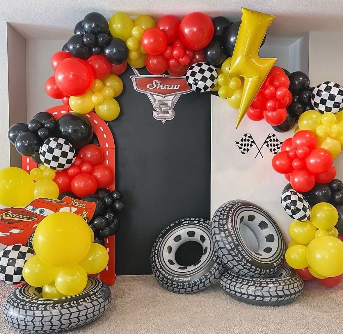 Customizable Backdrop with Balloons Yellow, Red and Black with Yellow Lightning, Wheels and Checkered Ball Foil and Cars Accents - Cars-Themed Perfect for special occasions