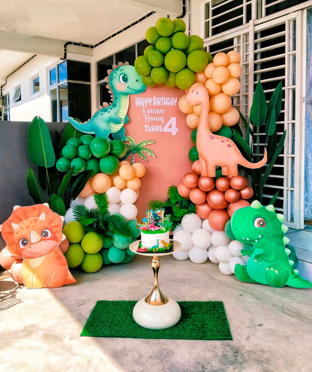 Customizable Board Backdrop with Balloon Beige, White, Chrome Pink and Green with Dinosaur Standee - Dinosaur-Themed Perfect for special occasion