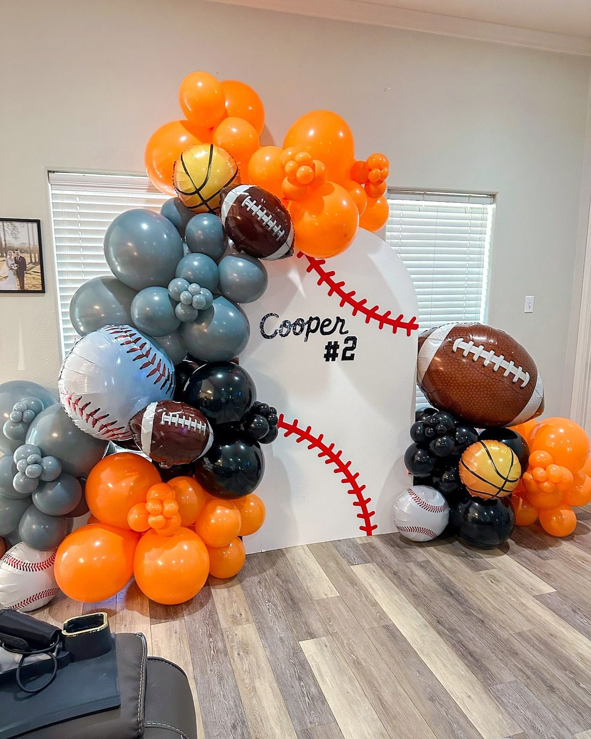 Customizable Board Backdrop with Balloon Blue and Orange with Sports Ball Balloon Accents - Sports-Themed Perfect for special occasions