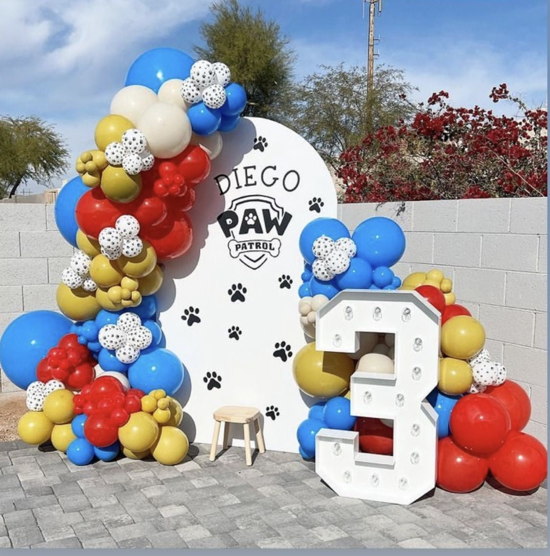 Customizable Board Backdrop with Balloon Blue, Red, Yellow and Paw Printed with LED Marquee Number ‘3’ - Paw Patrol-Themed Perfect for special occasions
