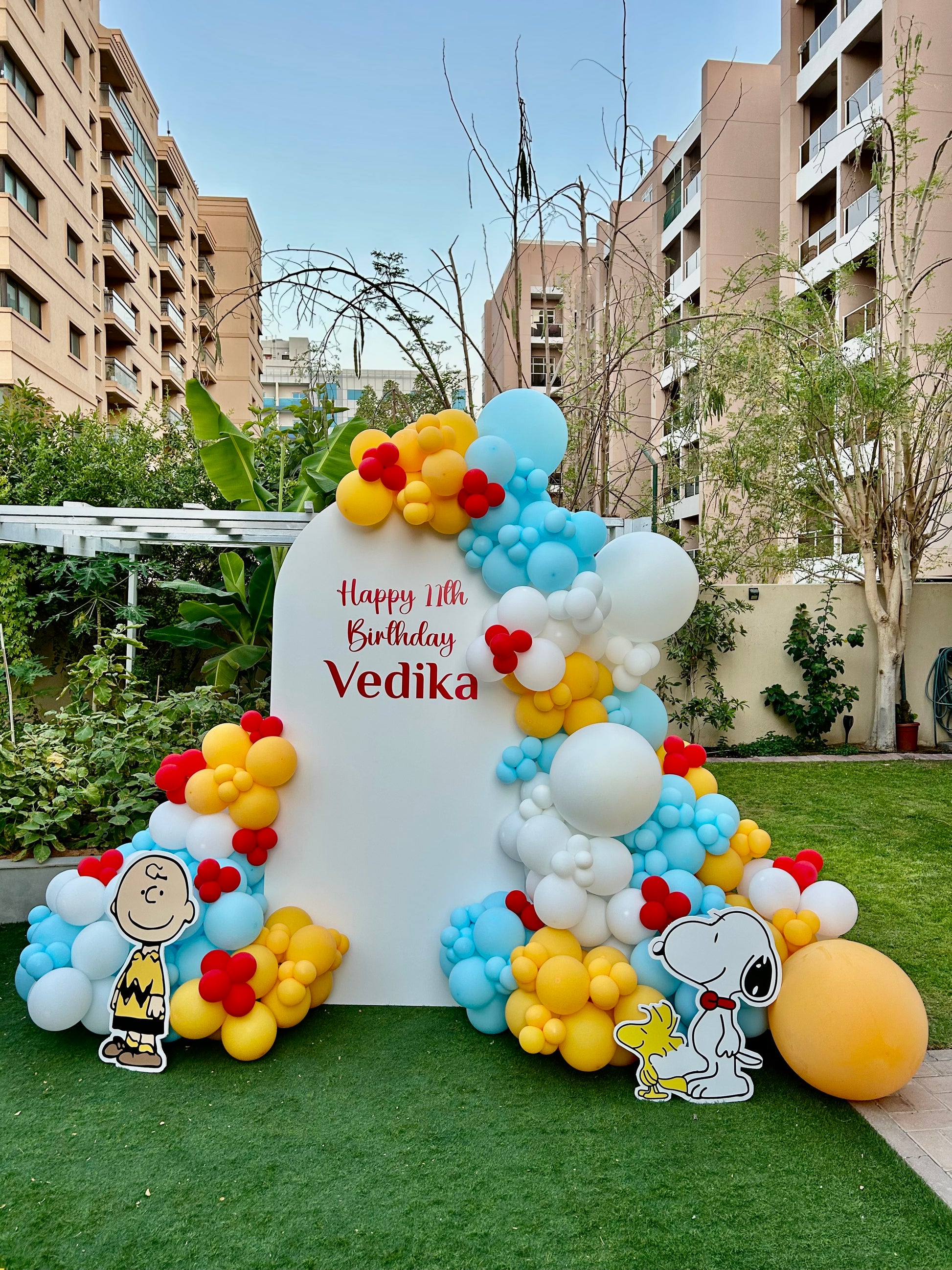 Customizable Board Backdrop with Balloon Blue, Red, Yellow and White Decor Setup - Snoopy-Themed Perfect for special occasions