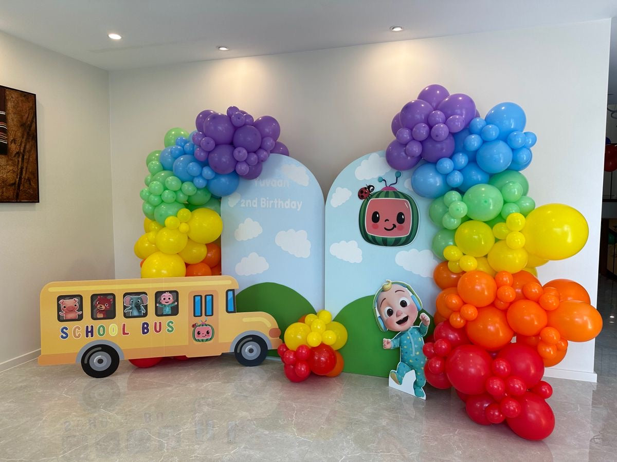 Customizable Board Backdrop with Balloon Blue, Yellow, Orange, Green and Red with JJ Character Standee and School Bus - Cocomelon-Themed Perfect for special occasions