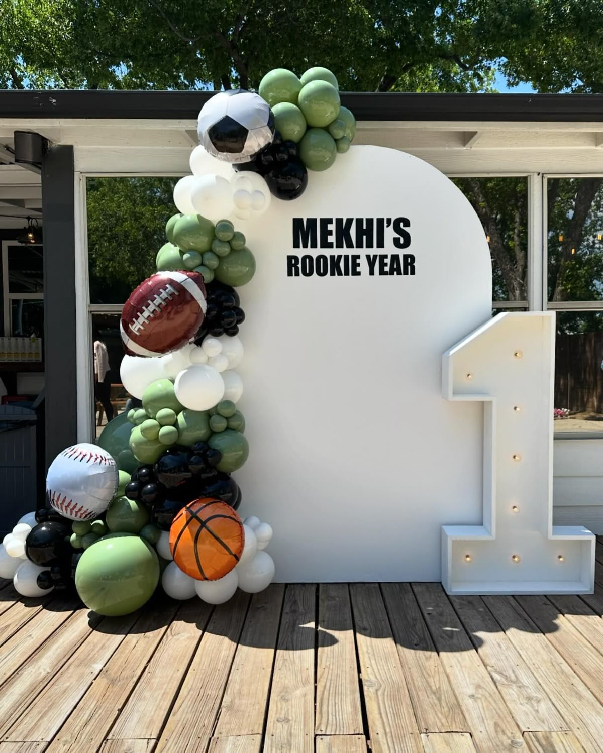 Customizable Board Backdrop with Balloon Green, Black and White with Sports Ball Balloon Accents and LED Marquee Number ‘1’ - Sports-Themed Perfect for special occasions