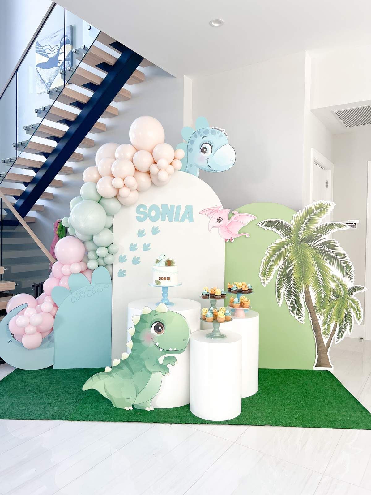 Customizable Board Backdrop with Balloon Pastel Colors Peach, Pink and Green, White Cake Stand and Dinosaur Balloon Standee - Dinosaur-Themed Perfect for special occasion