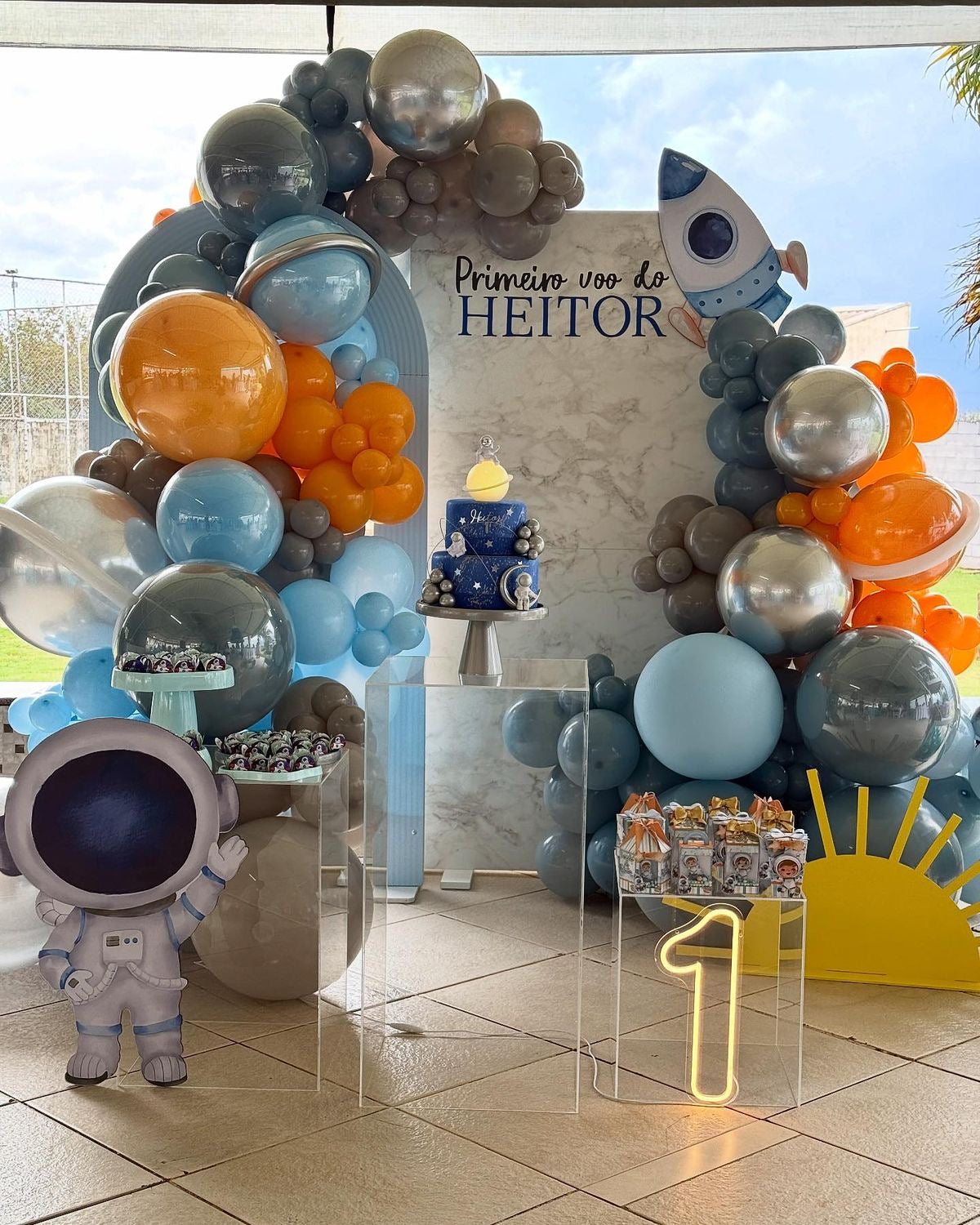 Customizable Board Backdrop with Balloons Orange, Dust White, Blue and Silver with Number ‘1’ Standee, Astronaut Standee, Rocket Accents and Acrylic Cake Stand Setup - Galaxy-Themed Perfect for special occasions