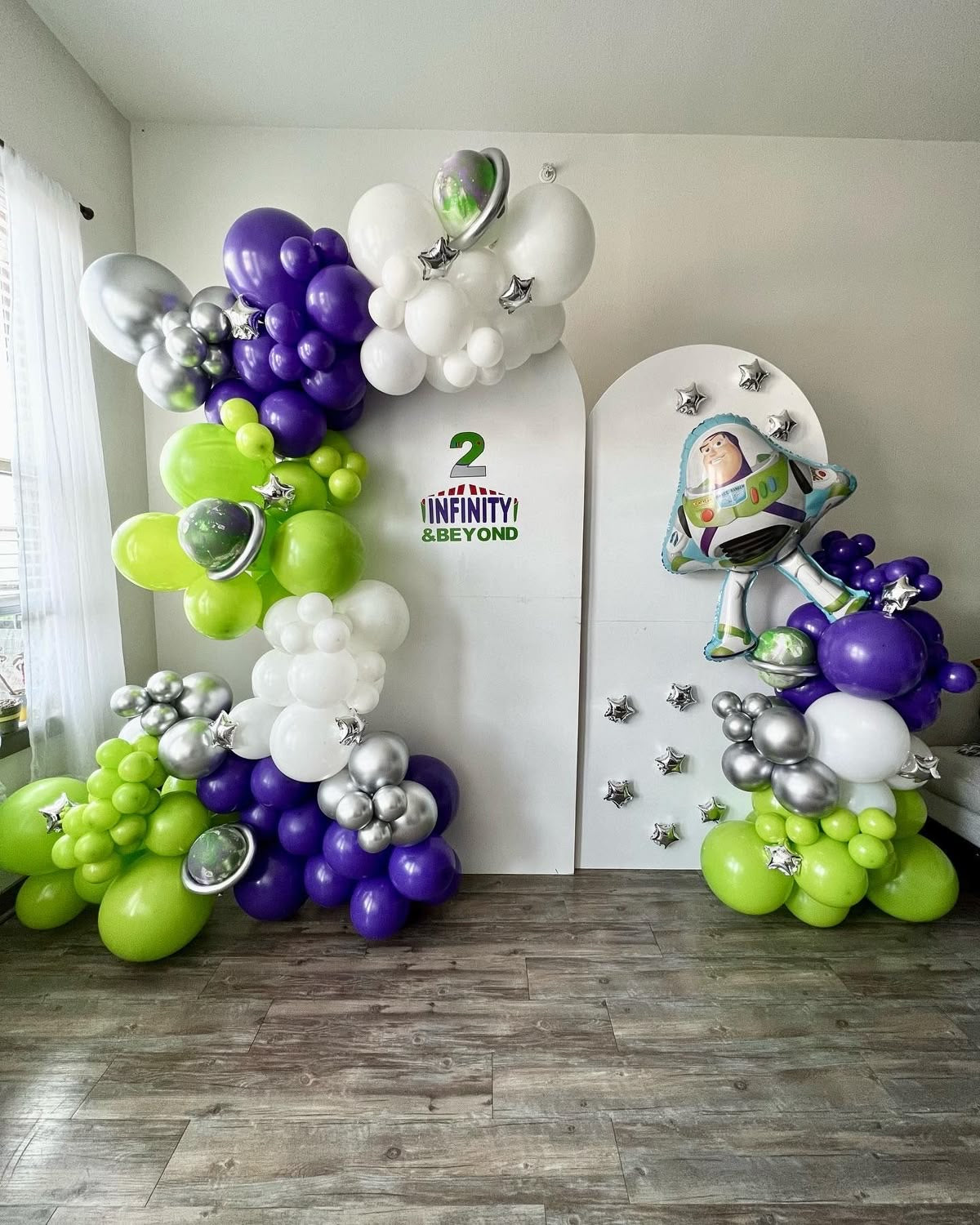 Customizable Board Backdrop with Balloons White, Green, Silver Purple and Mini Silver Stars accents and Buzz Lightyear Balloon - Toy Story-Themed Perfect for special occasions