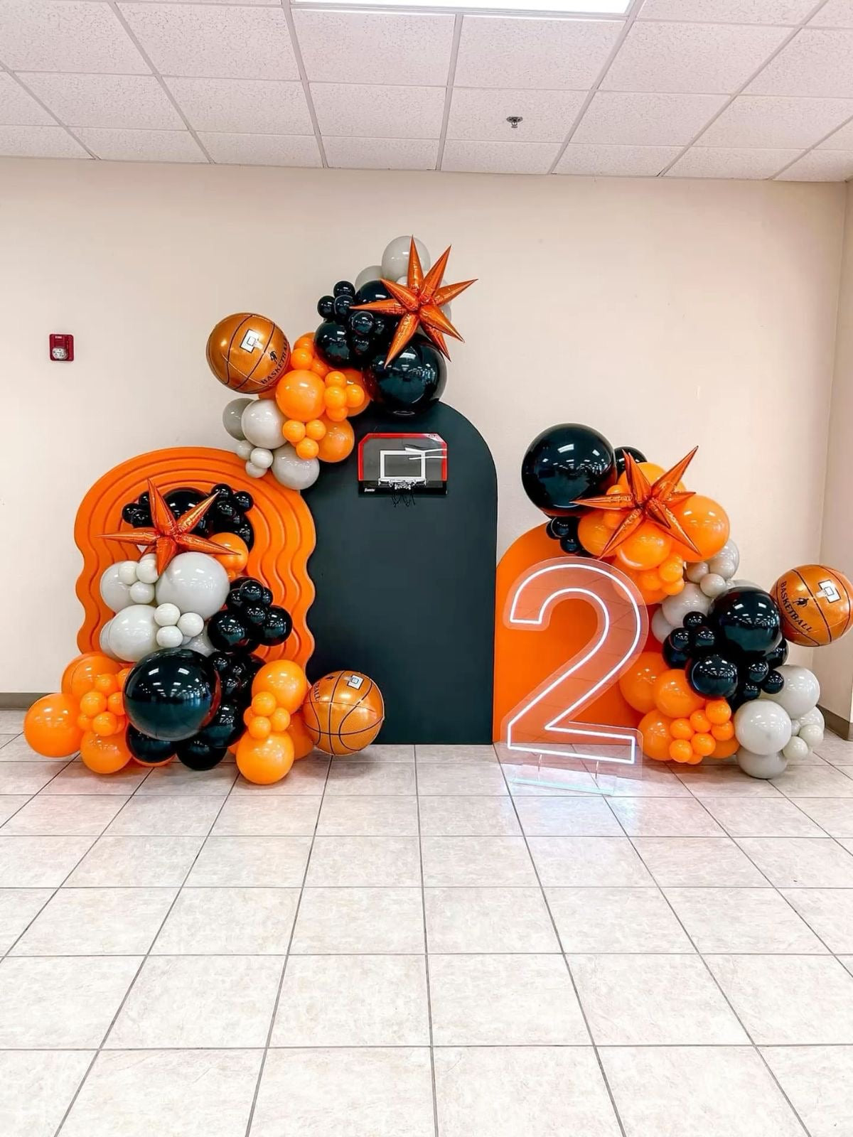 Customizable Board Ball Backdrop with Ring and Balloon Orange, Gray and Black with Ball and Stars accents, LED Marquee Number ‘2’ - Basketball Sports-Themed Perfect for special occasions
