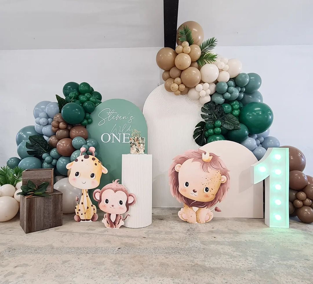 Customizable Board Jungle Backdrop with Balloon Brown, Sand White, Green, Beige and Blue with Artificial Leaves, LED Marquee ‘1’ Number, Animals Standee Lion Giraffe Monkey - Safari-Themed Perfect for special occasions