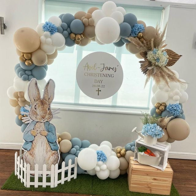 Customizable Board with Balloon Round Setup Blue, Dust White and Light Gold with Peter Standee and Artificial Leaves and Flowers - The Tale of Peter Rabbit-Themed Perfect for special occasions