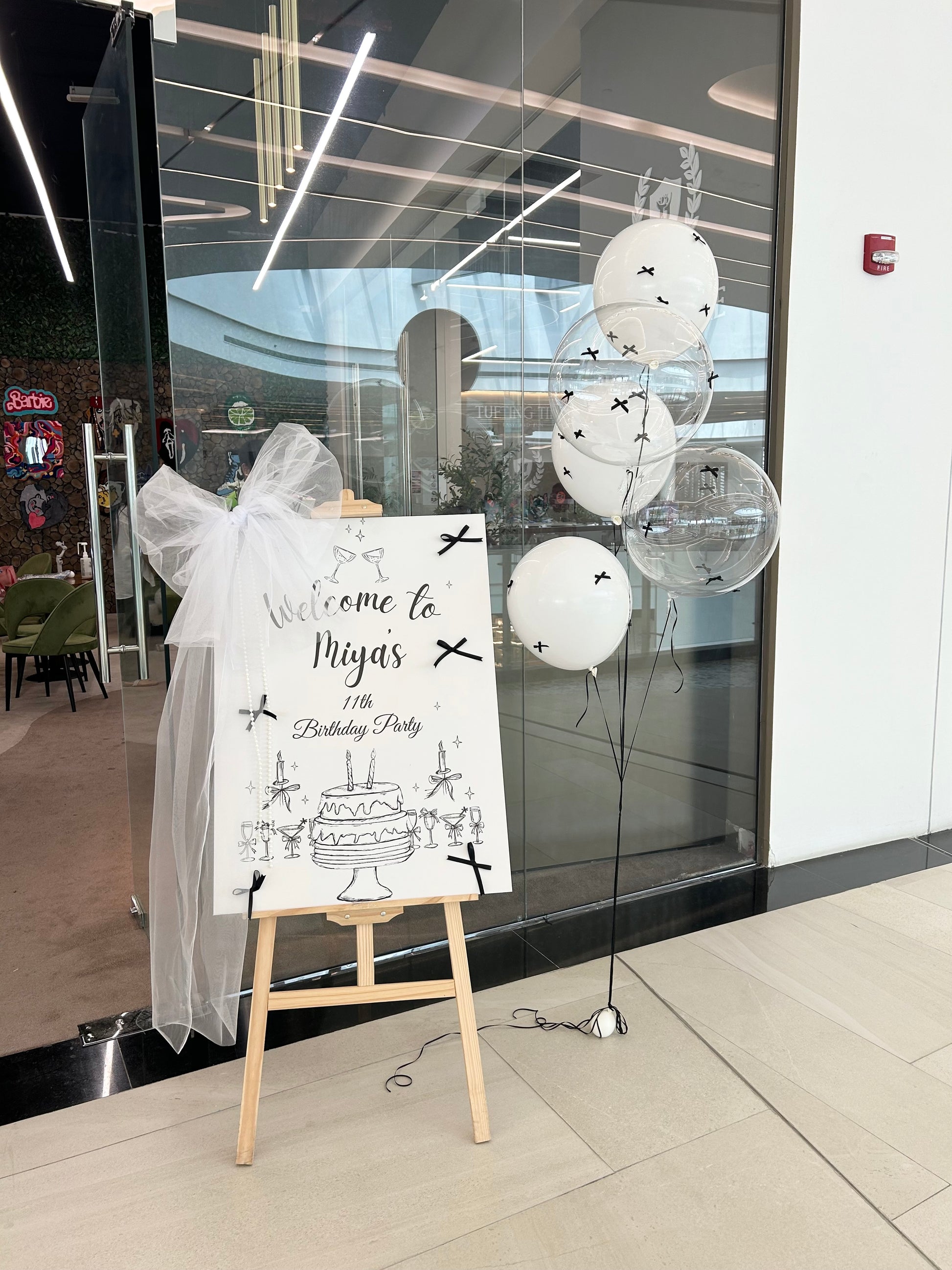 Customizable KT Board with Customize Ribbon and Wooden Stand Welcome Board and Helium Clear Balloon Bunch with Black Ribbon accents - Perfect for any occasions!
