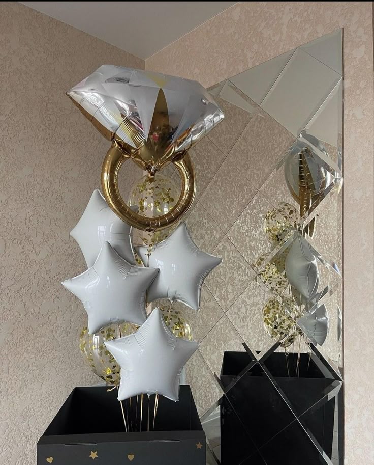 Engagement Gold Diamond Ring with Helium Bunch White Star-Shaped and Clear with Confetti - Bridal Shower Perfect for Special Occasions!