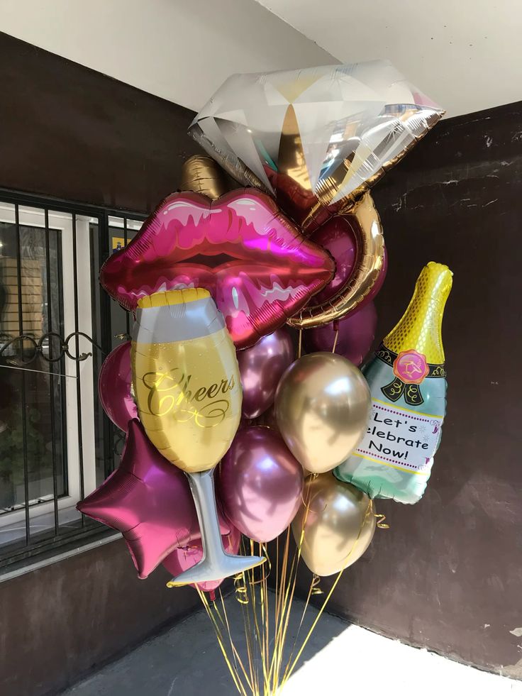 Engagement Gold Diamond Ring with Lips, Champagne Bottle and Glass, Helium Bunch Pink Star-Shaped and Chrome Pink and Light Gold Latex - Bridal Shower Perfect for Special Occasions!