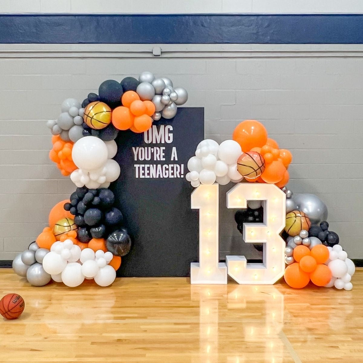 Full Set Customizable Board Backdrop with Balloon Ball, White, Silver, Orange and Black with LED Marquee Number ‘13’ - Basketball Sport-Themed Perfect for special occasions