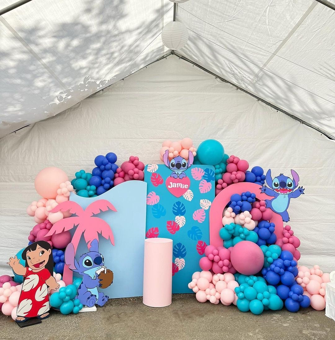 Full Set Customizable Board Backdrop with Balloon Blue, Turquoise, Dark and Light Pink with Stitch Characters Standee and Cake Stand - Stitch-Themed Perfect for special occasions