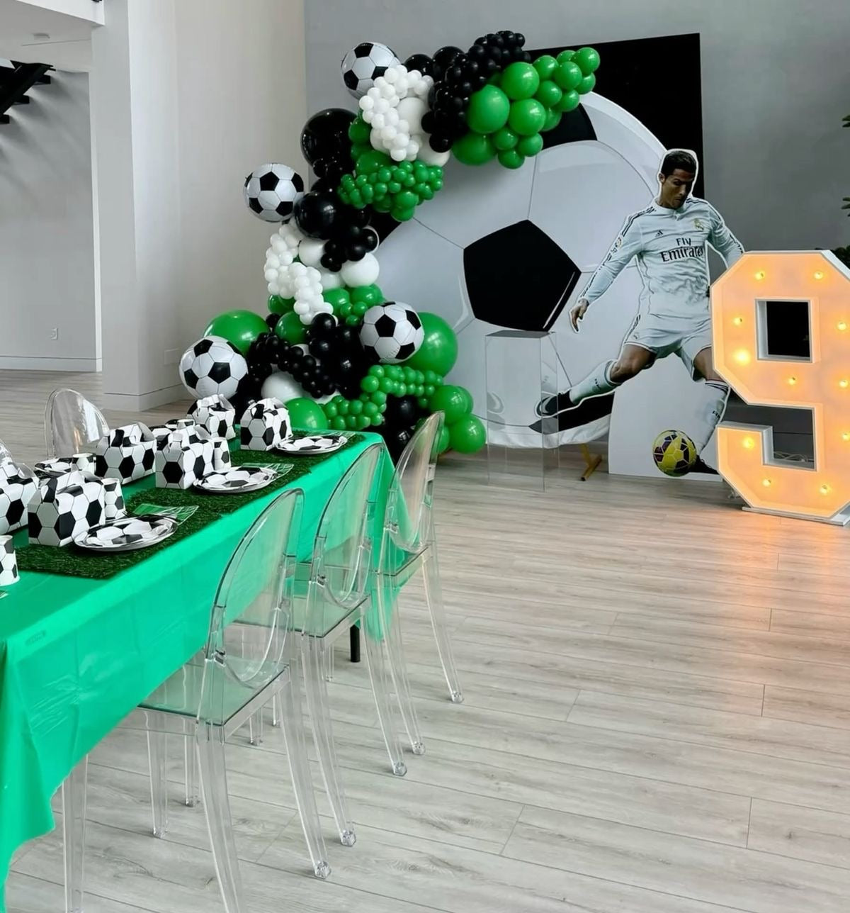 Full Set Customizable Board Backdrop with Balloon Soccer Ball, White, Green and Black with LED Marquee Number ‘9’, Acrylic Cake Stand and Player Standee - Football Sport-Themed Perfect for special occasions