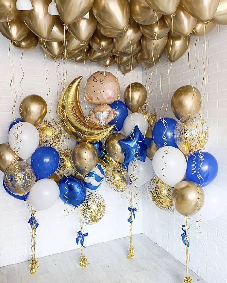 Ceiling and Bunch Helium Balloon Baby Boy, Gold Moon, Circle, Star and Candy Balloon with Latex Blue, White, Gold and Clear with Confetti - Baby Shower, Gender Reveal Perfect for Special Occasions!