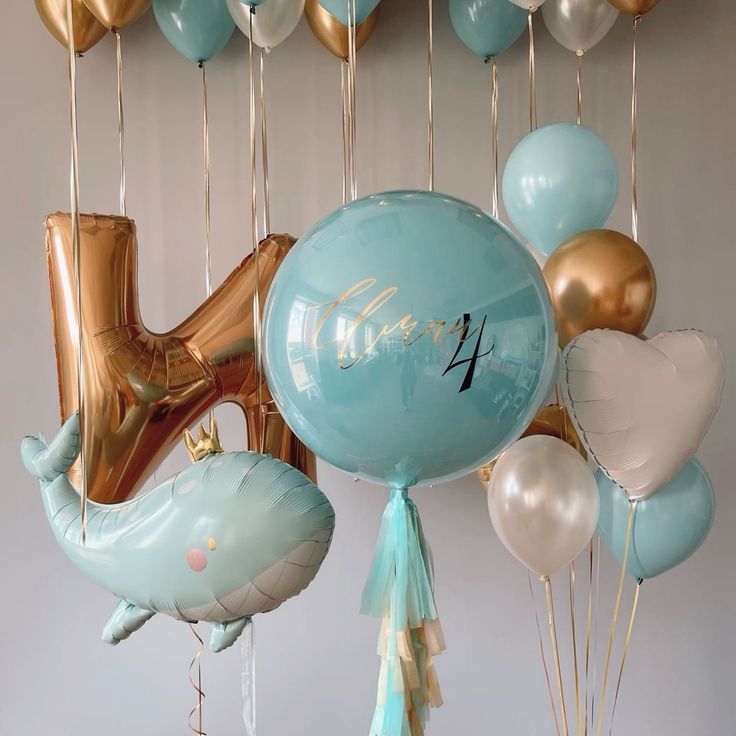 Helium Balloons Personalised Clear with Blue Latex and Customize Sticker, Latex Bunch Pear White, Blue and Gold with Whale and Letter Foil, Tassels and Ribbons - Customizable Decor