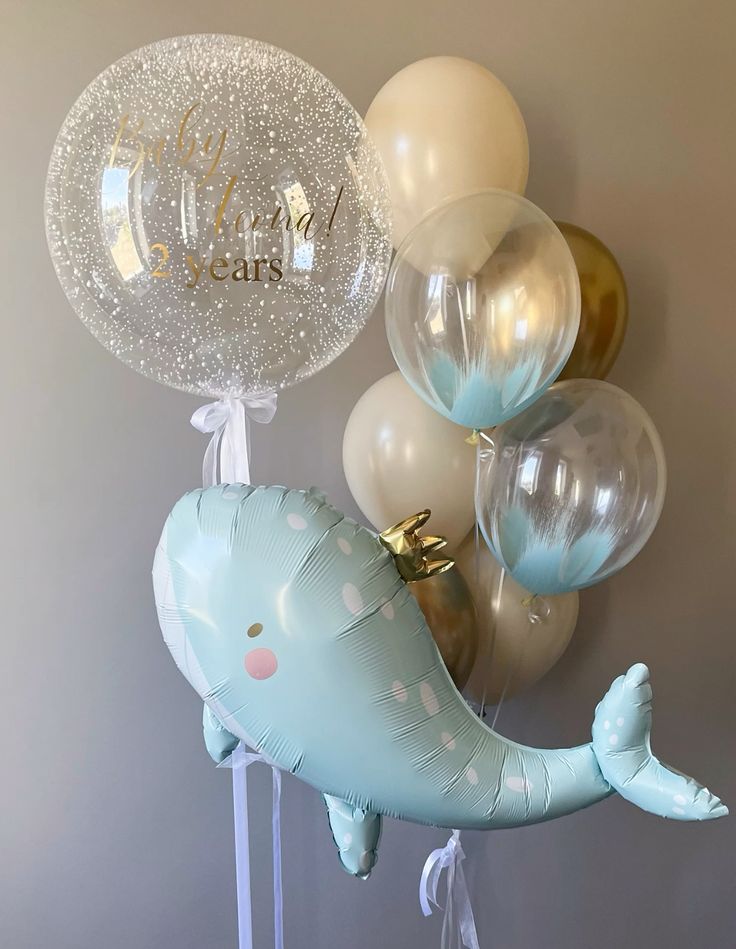 Helium Balloons Personalised Clear with White Foam and Customize Sticker, Latex Bunch Clear, Beige and Light Gold with Whale - Customizable Decor