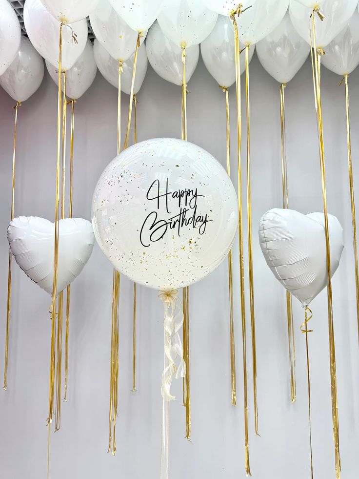 Helium Balloons Personalised Clear with White Latex, Confetti, Customize Sticker, Latex Ceiling White with Heart-Shaped Foil with Tassels - Customizable Decor