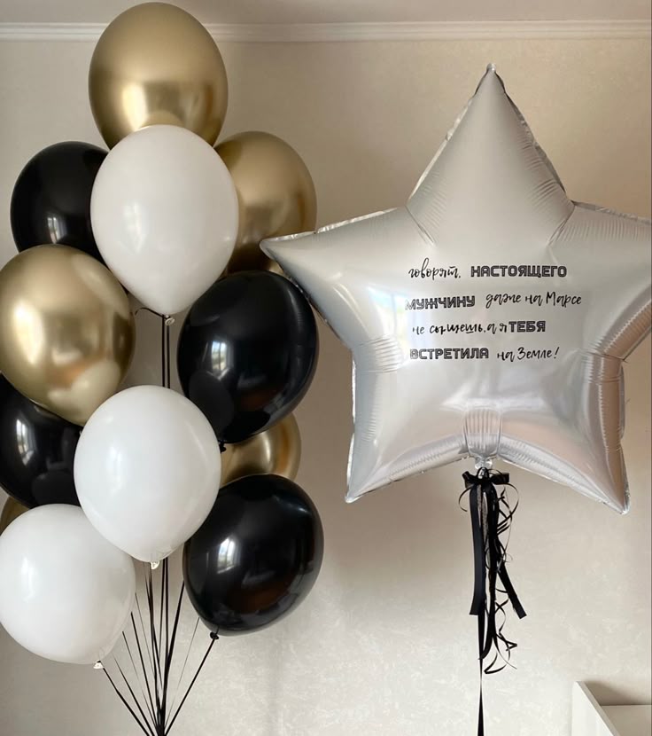 Helium Balloons Silver Star with Customize Sticker, Ribbons and Latex Helium Bunch Light Gold, White and Black - Customizable for Any Celebration